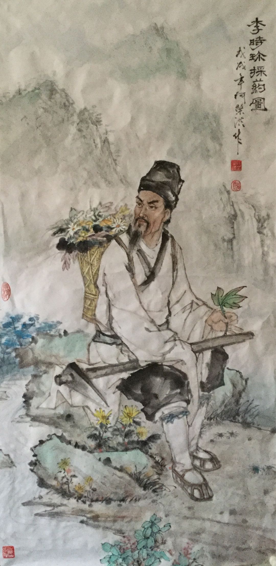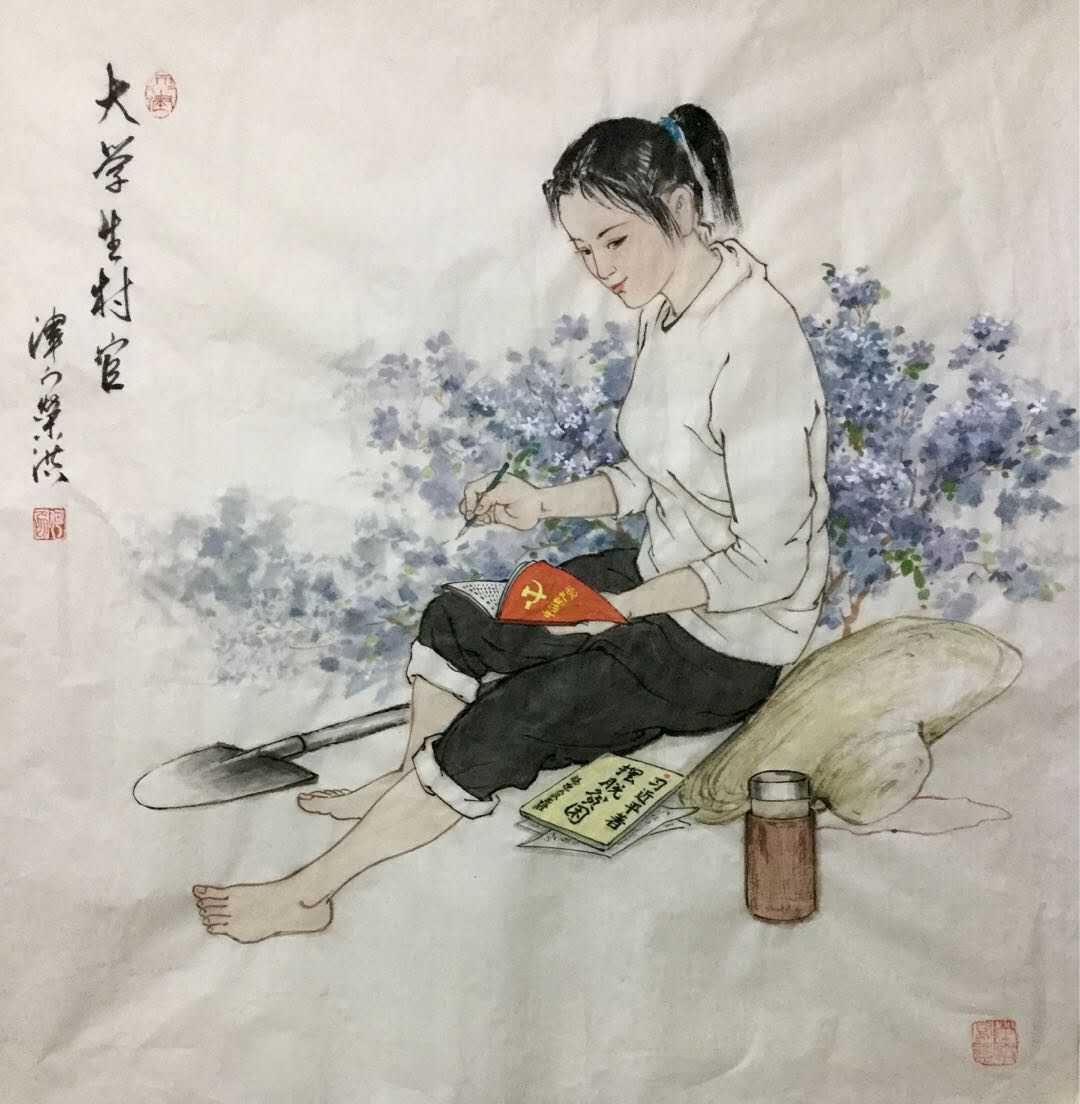 何荣洪先生还善于画命题画。他应邀为宋氏宗亲创作的宋氏鼻祖《微子画像》将微子刻画的栩栩如生。令人肃然起敬,万人敬仰。凡是来到画像面前的人都要情不自禁地鞠上一躬。何老师还为太平洋医药科技集团画的《李时珍采药图》更是维妙维肖。看了这幅画使人马上联想到李时珍不辞千辛万苦到深山老林去采草药,最后写下了不朽之作《本草纲目》。前不久,由市纪委驻市委宣传部纪检组、驻天津日报纪检组、驻市文广局纪检组在天津美术馆举办宣传思想文化系统廉政文化作品展,何荣洪的《大学生村官》不但被选入展,还被发表在《支部生活》上。这幅作品画了一个女大学生赤着双脚坐在田间地头,手拿党章,认真学习,旁边还放着习主席关于《摆脱贫困》的著作。这幅作品非常形象地描写了当代大学生下到最艰苦的农村去当村官。人物刻画细腻,线条流畅,构图新颖。生动体现了何荣洪先生善于刻画人物的深厚